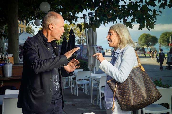 Devant l’Hostellerie de Genève, qui a très aimablement accueilli cette table ronde sur la place du Marché de Vevey, Bertrand Piccard retrouve Isabelle Smaniotto, une amie et lectrice de «L’illustré» venue assister au débat.