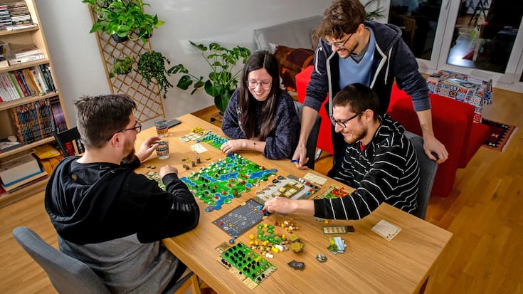 «Ces jeux demandent parfois de s’investir longtemps, ils ne sont pas de tout repos», confie Thibault Usel, amateur de jeux de société (à dr.) avec ses amis Jérémie, Sandrine et François (de g. à dr.). Ils jouent à «Clans of Caledonia».