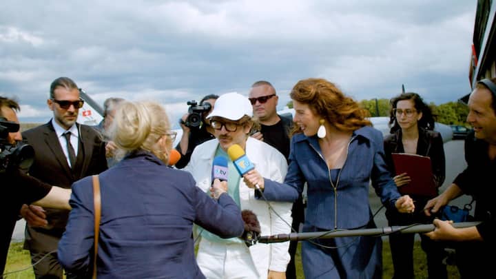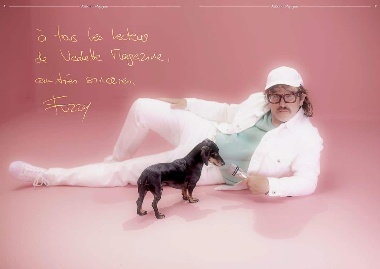 Guillaume PerretTout y est, non sans sa touche d’ironie délicieuse, l’une de ses marques de fabrique. Le pantalon blanc, le micro argenté, le teckel, les poses lascives rappelant les posters des magazines people des années 1990 que les ados collectionnaient pour accrocher leurs boys bands favoris au-dessus de leur lit.