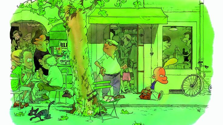 Ceci s’appelle une mise en abyme: Zep (à g.) voit avec effarement passer son personnage à l’heure de l’apéro. Sans doute une hallucination découlant des milliers de fois où le premier a dû dessiner le second.