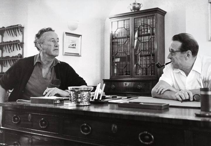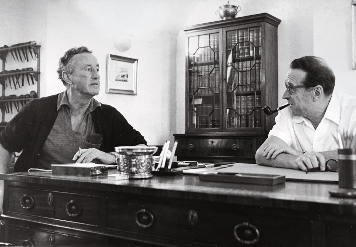 La rencontre en 1960 entre Ian Fleming et Georges Simenon au château d’Echandens, alors domicile de l’écrivain belge. Les pères de James Bond et de Maigret n’ont cessé pendant leur entretien de se jeter des piques ou de comparer les performances de leurs voitures de luxe. Au grand étonnement du photographe.