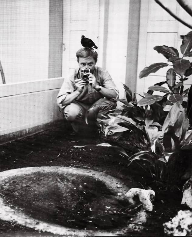 Yves Debraine au zoo de Bâle lors d’un reportage pour «L’illustré» dans les années 1960. En s’envolant, l’oiseau a arraché net une touffe de chevaux du photographe. L’auteur de cet instantané facétieux est le journaliste Georges Gygax, avec lequel le photographe a longtemps travaillé.