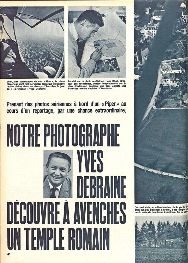 Mon autre héros était bien sûr mon père. Par exemple lorsque j’apprenais qu’il avait découvert un temple romain à Avenches. Indiana Jones avant la lettre! Jusqu’à il y a peu, je considérais ce souvenir comme peu fiable, voire faux. En plongeant pour cet article dans les archives d’Yves Debraine, j’ai découvert que l’histoire était vraie. Si vraie que L’illustré y avait consacré deux pleines pages en novembre 1964. Au retour d’une prise de vue aérienne dans la région de Berne, le photographe et son pilote avaient remarqué dans un champ une étrange forme blanche, «comme le plan flou d’un bâtiment», écrivait Yves Debraine dans l’article qui accompagnait ses photos. L’archéologue cantonal avait jugé la découverte «d’une importance extrême». Toujours modeste – cette qualité est restée une constante sa vie durant –, mon père avait mis la trouvaille au compte «d’exceptionnelles conditions d’hygrométrie du sol».