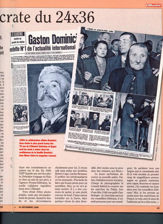 Yves Debraine dans L’illustréIl avait la même réaction lorsque Jean Giono le félicitait pour ses photos de l’affaire Dominici, célèbre histoire criminelle des années 1950. Un patriarche provençal, Gaston Dominici, avait été accusé d’avoir assassiné une famille anglaise.