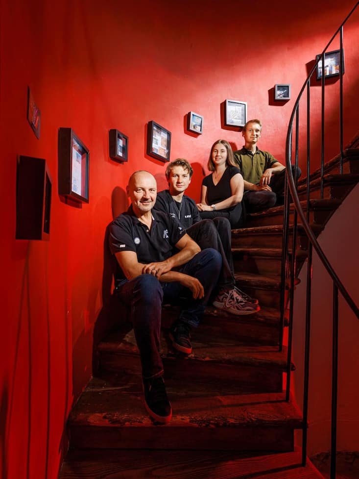 Jean-François Fischer et ses enfants, Guillaume, Noémie et Louis, dans l’escalier de la villa familiale à Etoy (VD).
