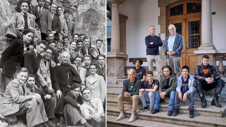 Des élèves de syntaxe entourant le chanoine Cornut en 1941 (à g.) et le chanoine Antoine Salina, directeur depuis 1990, accompagné de François Lachat et de six des sept derniers pensionnaires (Ryan, Jan, Arnaud, Maxence, Gaël et Bastien - de g. à dr.)